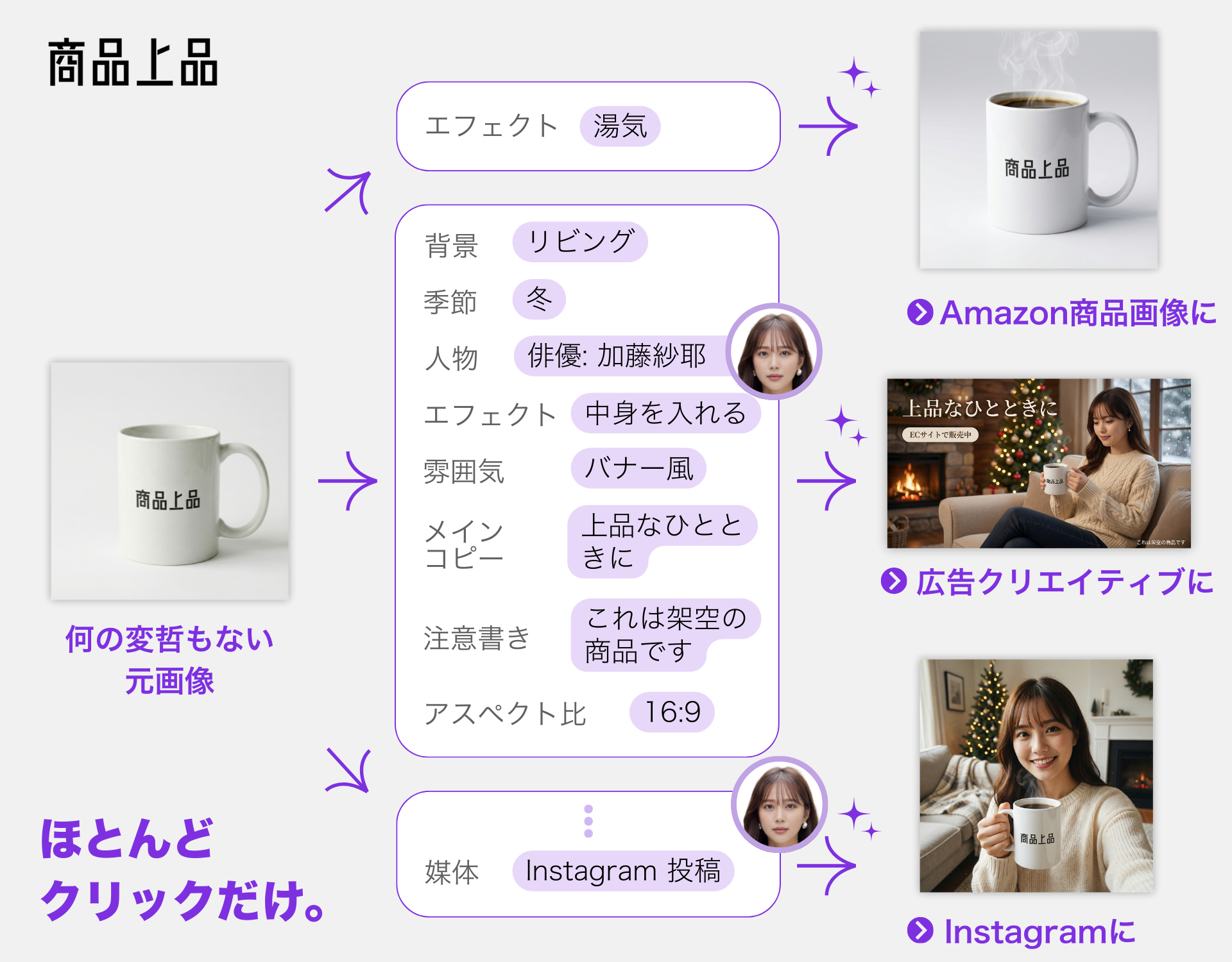 - ECサイトに登録された商品情報をもとに、AIが広告用の画像・動画、CMシナリオやナレーション案まで自動生成。AIへのプロンプト記述は不要です。制作者は「ゼロから」ではなく「AI案をブラッシュアップする」ワークフローに移行できます。