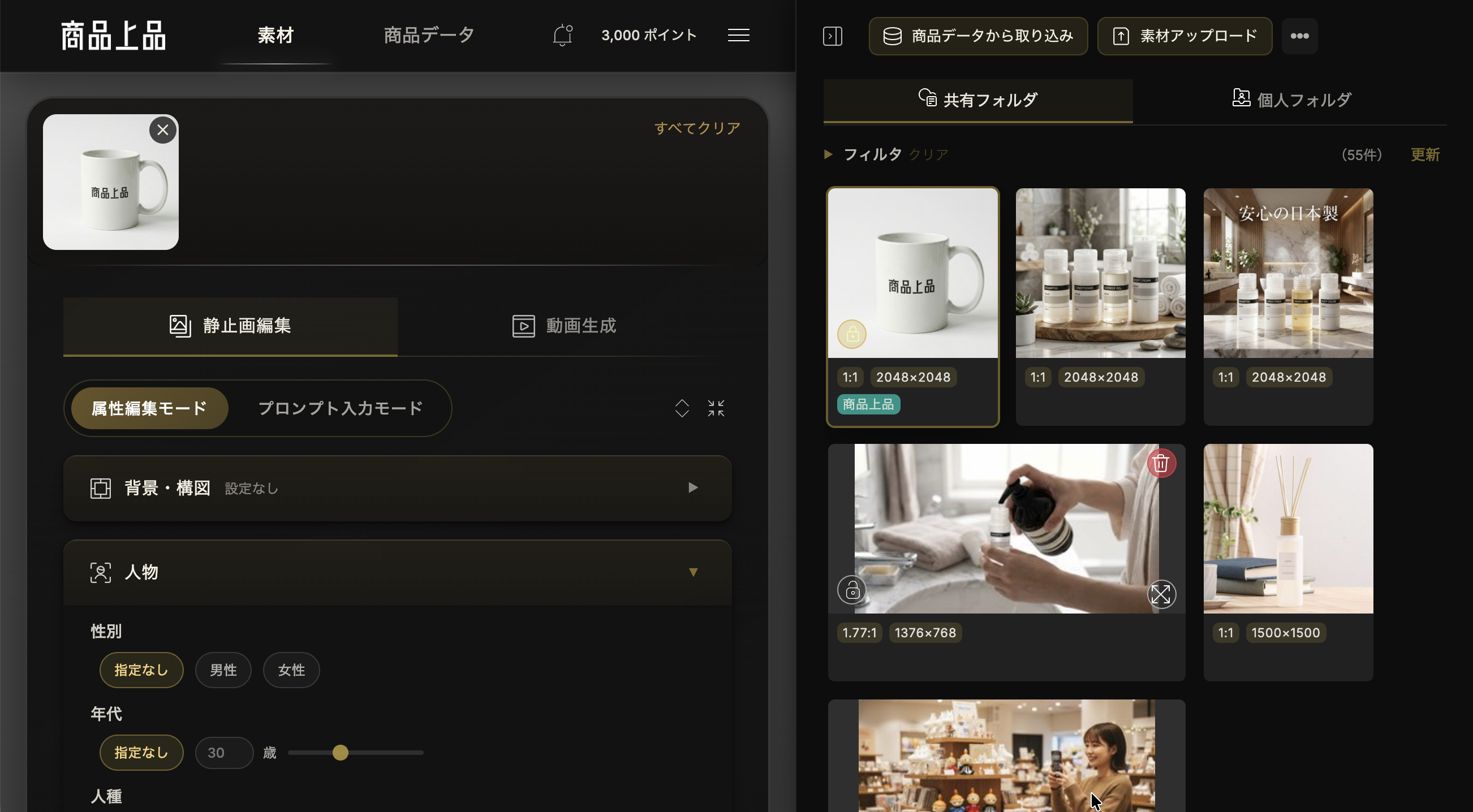 「商品上品」は、こうしたメーカー/EC出店者が、少人数のマーケティング・デザインチームでも、高品質な商品画像・動画を量産できることを目的に開発された、クラウド型AIクリエイティブプラットフォームです。